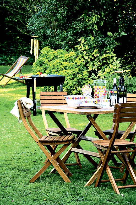 Стол, стулья в зоне барбекю нужно выбирать огнеупорные, плюс те, что легко чистятся от грязи, сажи и жира.