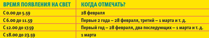 Другой интересный вопрос, мучащий «счастливчиков», которым повезло появиться на свет 29 февраля. Когда же им отмечать день рождения, если год не високосный? Ну не строго же по календарю с трехлетними перерывами и не говорить всем, что тебе в 4 раза меньше лет, чем на самом деле?! С одной стороны, заранее принимать поздравления – плохая примета, а с другой – при чем тут первый весенний день, если появился на свет в последний день зимы и чувствуешь свою связь с ней? Общепринято правило для именинников: появились на свет до полудня – принимайте поздравления 28 февраля, а если родились после – тогда уже веселитесь 1 марта. Есть и более подробная система, основанная на часе рождения. Главное, чтобы друзья и близкие в ней не запутались.