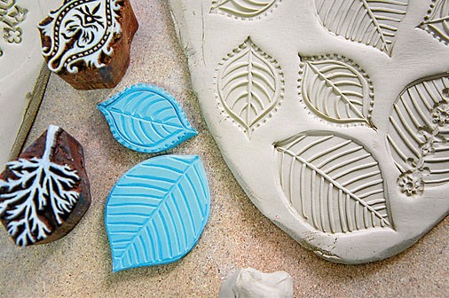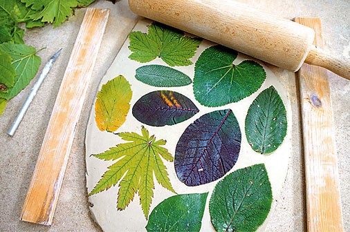 Раскатай глину в блин. Приложи листья жилками вниз, пройди сверху скалкой.