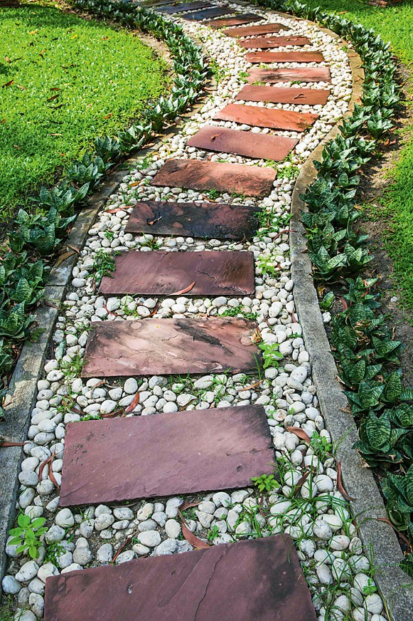 От калитки к дому или от дома к бане – везде нужен удобный проход. Его вполне можно сделать из обычного щебня или маленьких камней, а также кирпича и прочной тротуарной плитки. План работ такой: очисти от травы предполагаемый участок и очерти границы будущей дорожки. Далее возьми острую лопату и по границе (с обеих сторон) сними небольшой слой земли. Это необходимо для того, чтобы надежно закрепить бордюр из кирпича! Аккуратно уложи кирпич широкой стороной, чтобы получилась красивая прямая или плавная линия. Утрамбуй землю вокруг кирпичей. Внутрь образовавшейся основы дорожки насыпь щебень или камни. Сверху на некотором расстоянии друг от друга уложи тротуарную плитку. И последний штрих – живой декор. Для его создания подойдут любые низкорастущие растения. Высади их вдоль дорожки, с обеих сторон. Совет: если не хочешь, чтобы между камней прорастала сорная трава, перед высыпанием щебня (камня) обработай землю любым химическим средством из магазина для садоводов.
