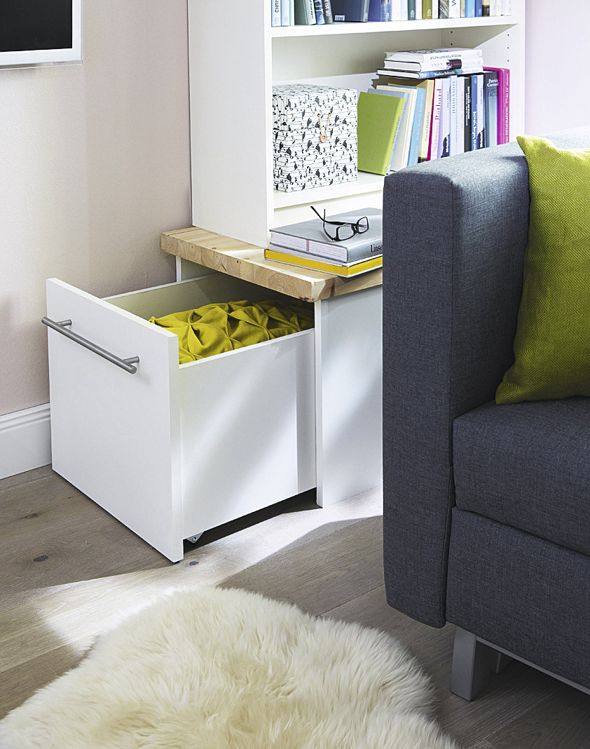 Это весьма эргономичное решение, позволяющее организовать хранение большого количества вещей без потери полезной площади квартиры. Чаще всего для этих целей используют кровати или диваны с выкатными ящиками, коробами под матрасами, полками под ногами или в изголовье. Наиболее удобный вариант – выдвигаемые ящики. Они бывают нескольких видов.