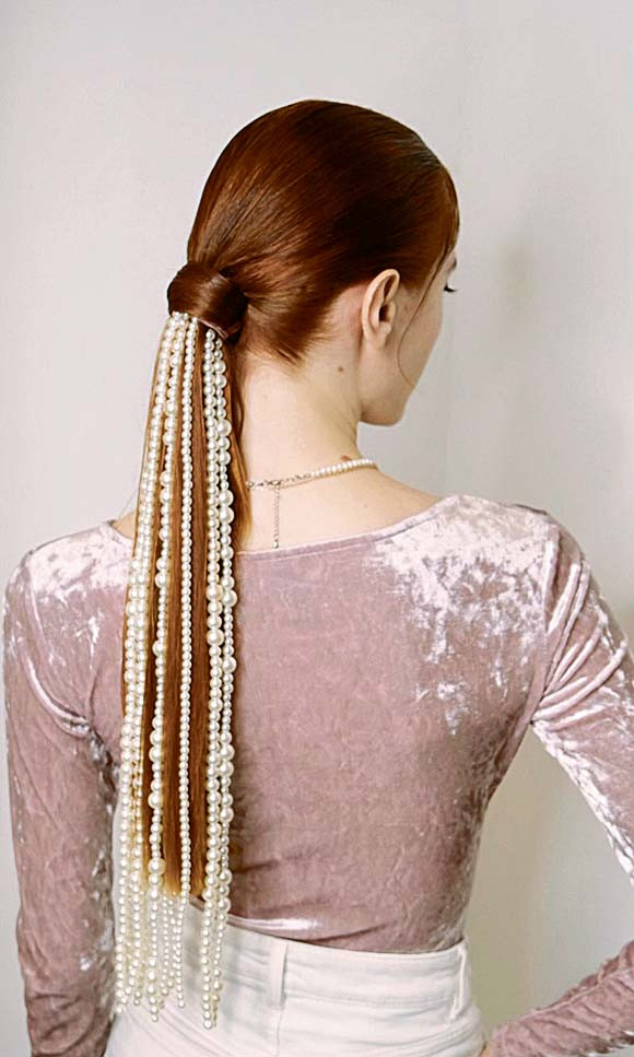 Обычный хвост превращается в вечернюю прическу, если добавить украшение – нити искусственного жемчуга. Владычица морская позавидовала бы! Гладко зачесывая волосы, собери хвост и зафиксируй резинкой. К основанию хвоста прикрепи украшения (найти подобные легко на любом маркетплейсе). Выдели прядь, разгладь ее, сбрызни лаком и оберни поверх резинки и крепления украшения, чтобы скрыть их (результат – на фото 1).