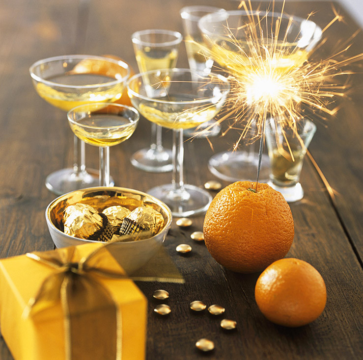 Даже если ты не устраиваешь пышное торжество, а решила ограничиться скромным фуршетом, стол может выглядеть оригинально. Например, сделай главной темой «оранжевое настроение»: помогут апельсины в качестве подставок под бенгальские огни и конфеты в золотистой обертке.