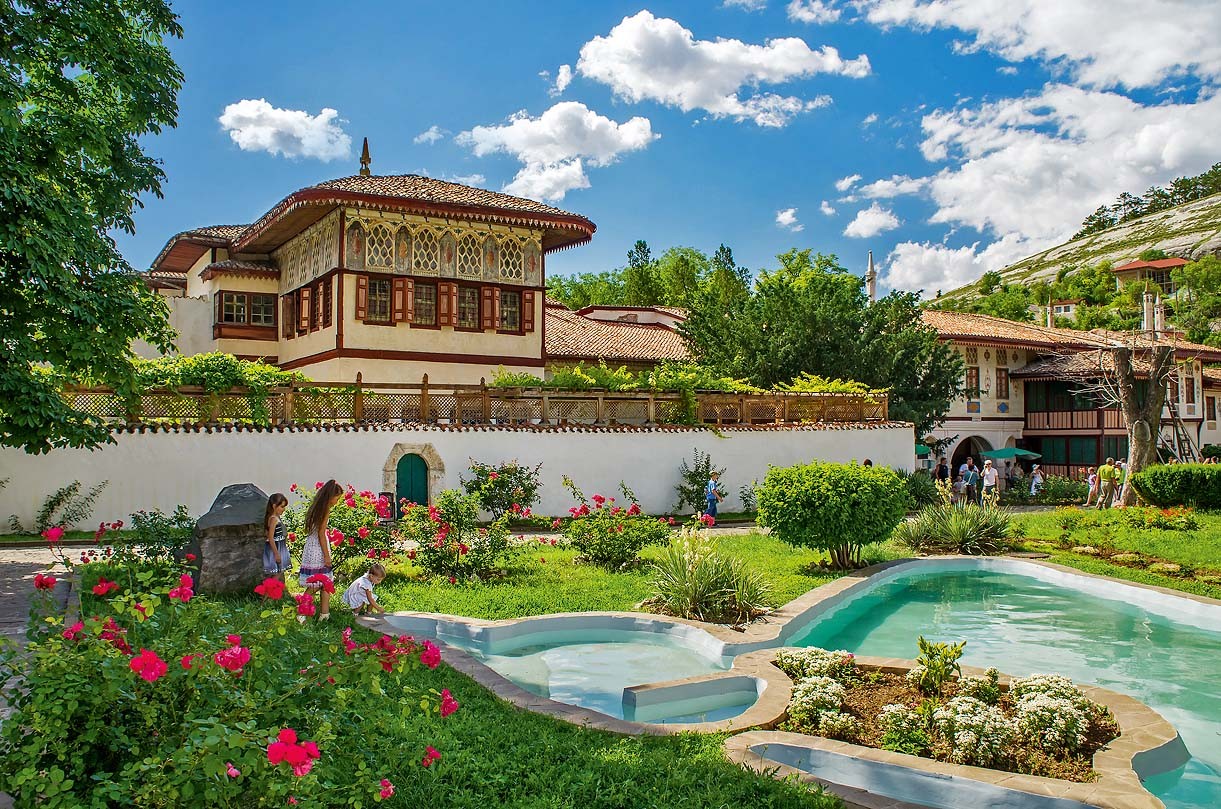 ДАЛЕЕ ПО СЕВЕРНОМУ СКЛОНУ горы через Большой каньон Крыма спускаемся на машине в Бахчисарайский район. Наша цель – городок Бахчисарай и его Ханский дворец. Единственный в мире образец крымско-татарской архитектуры. Здесь изящные башни-минареты, внутренние дворики с фонтанами, самый известный из которых – Фонтан слез, воспетый Пушкиным. Зал дивана (государственного совета) и помещения гарема ничуть не уступают в роскоши интерьерам Топкапы — резиденции османских султанов в Стамбуле.