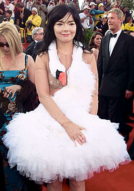 13. Одним из худших нарядов признан «лебединый» костюм Бьорк. Тушку лебедя из фатина исландская певица дополнила клатчем в виде яйца.