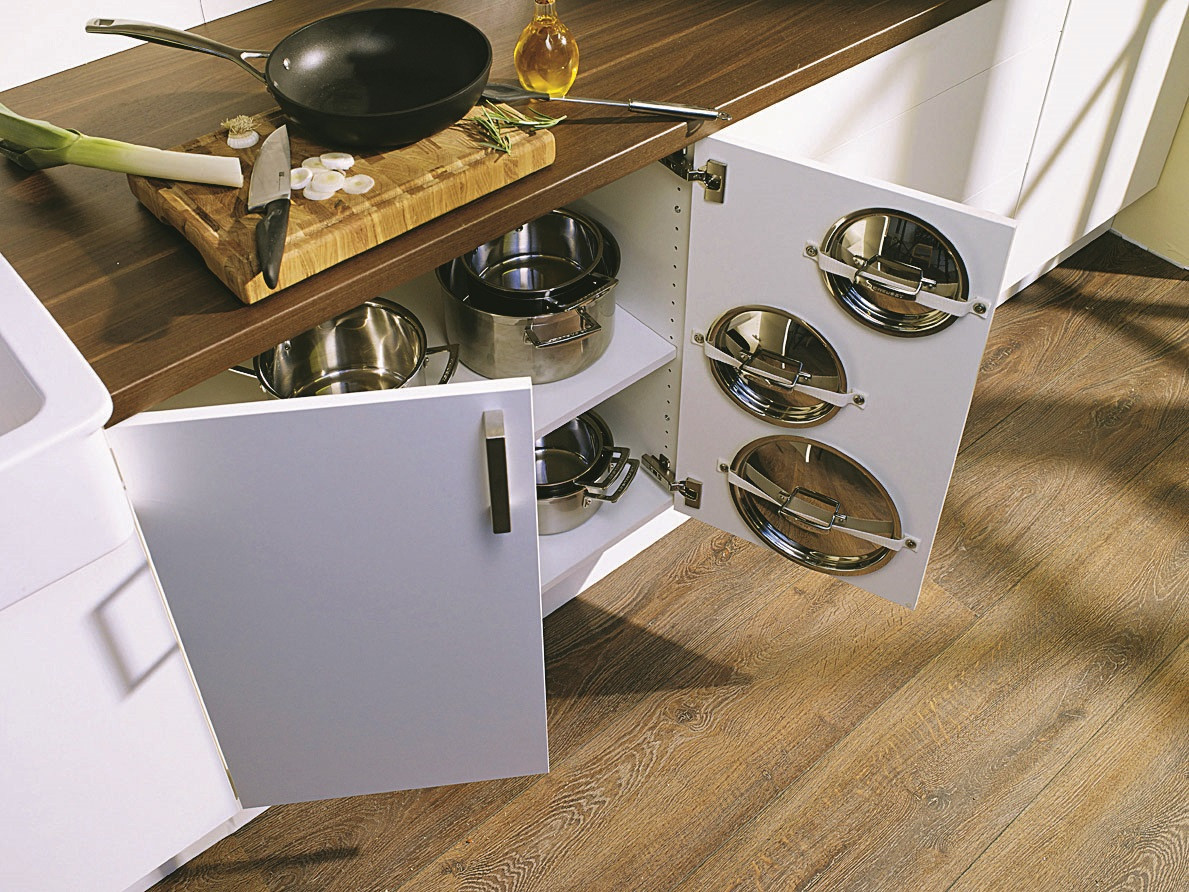Интересное решение для плоских предметов – крышек, разделочных досок, ножей. Можно снабдить это пространство крючками, магнитами или полочками. Но сильно перегружать дверцы нельзя, петли выйдут из строя.