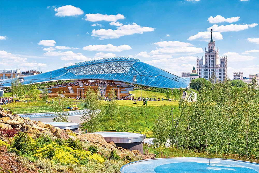 Если все же хочешь иметь на память фото Кремля, сделай его с территории парка «Зарядье». Он расположился под самыми стенами символа страны, поэтому отсюда открываются лучшие (читай – нескучные) ракурсы на древнюю крепость. Другая «фишка» «Зарядья» в том, что ландшафты здесь воссоздают несколько климатических зон России. Теплолюбивые растения тоже растут на открытом воздухе, но прячутся под прозрачной кровлей, которая называется «Стеклянная кора». Она, словно летающая тарелка, зависла над центром парка, позволяя посетителям проявлять фантазию в фотографировании себя и пейзажей вокруг.