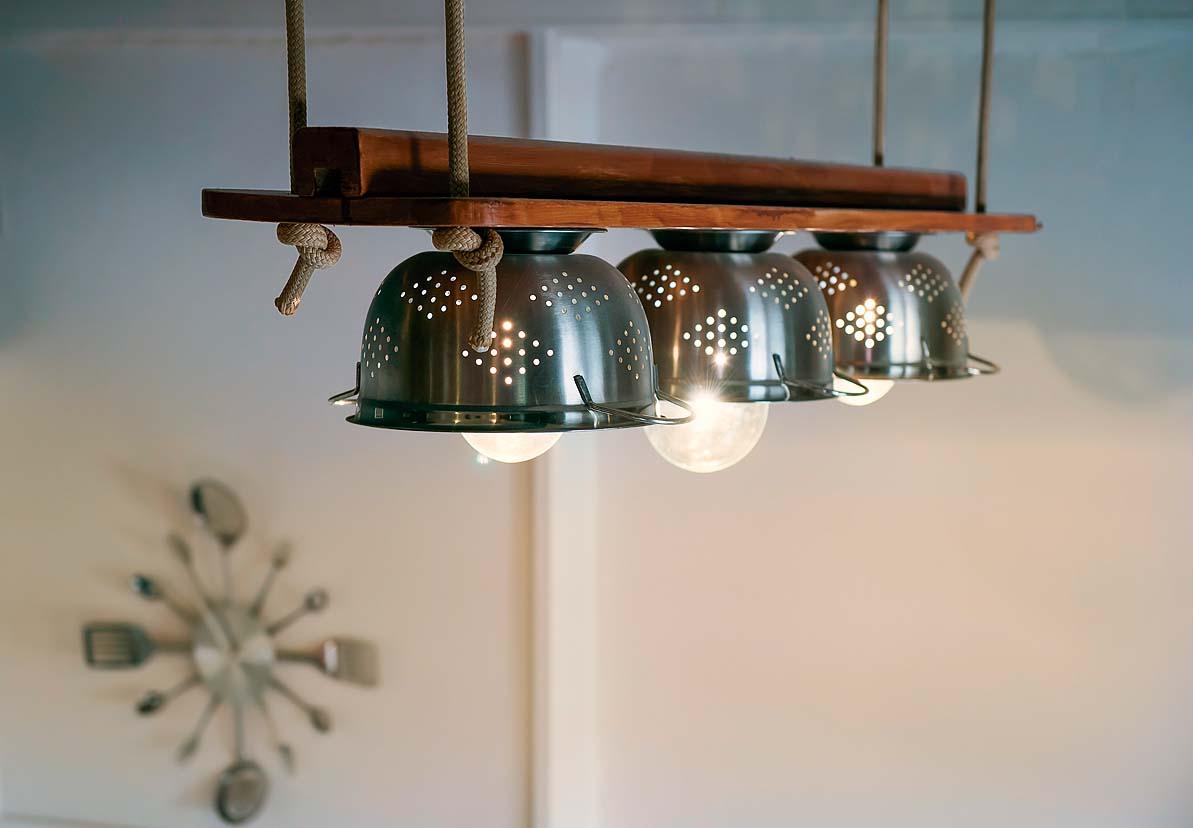 1. Просверли отверстия в донышках дуршлагов и закрепи лампы. Для этого предварительно отсоедини кабели от розеток и вставь их в отверстия в «плафонах».