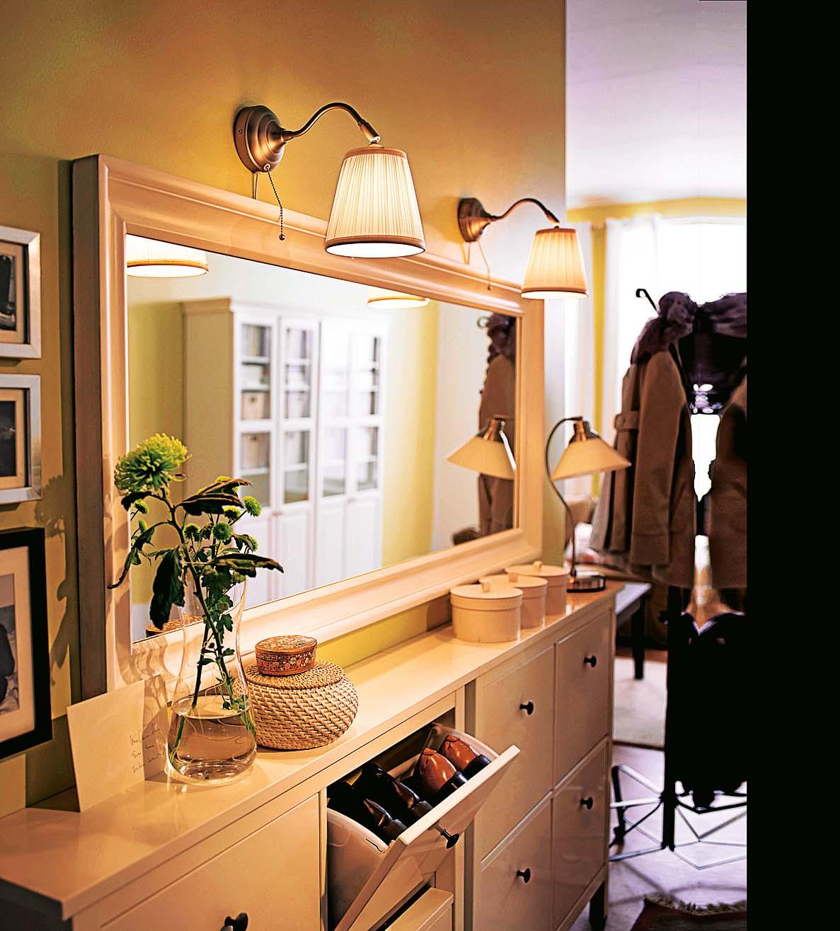 Конечно же, с порога! Обустрой эту зону так, чтобы всегда было приятно возвращаться. Одного потолочного светильника мало – повесь бра над зеркалом, поставь торшер. И обязательно выведи для них отдельные выключатели.