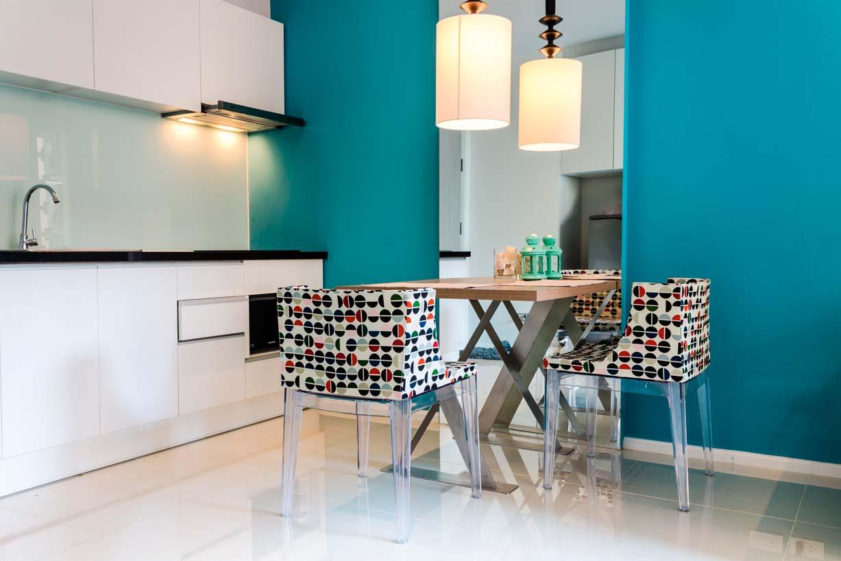 Удачная идея для зонирования кухни – сочетание яркой подсветки на кухонной стенке с уютным подвесным светильником (или несколькими) над обеденным столом.