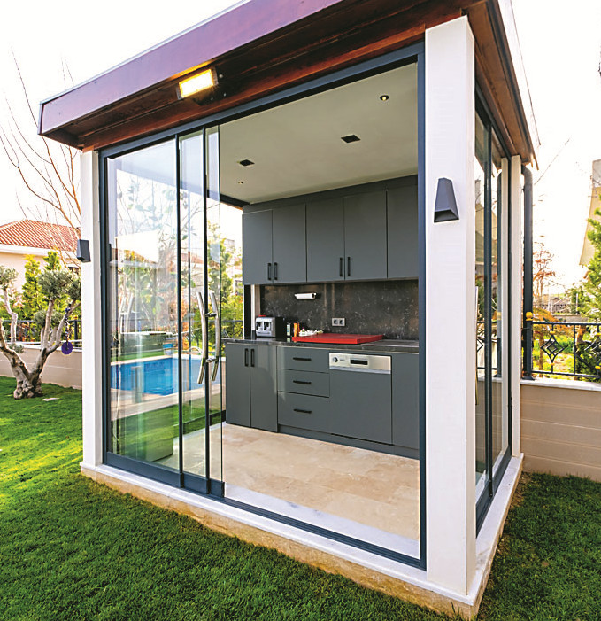 Начнем со шкафов – их должно ровно столько, чтобы вместить все самое необходимое, но при этом не оставить возможности для захламления свободных уголков. Размеры мебели и расстояние между предметами на летней кухне должны быть оптимальными как для рабочего процесса, так и для комфортного отдыха: