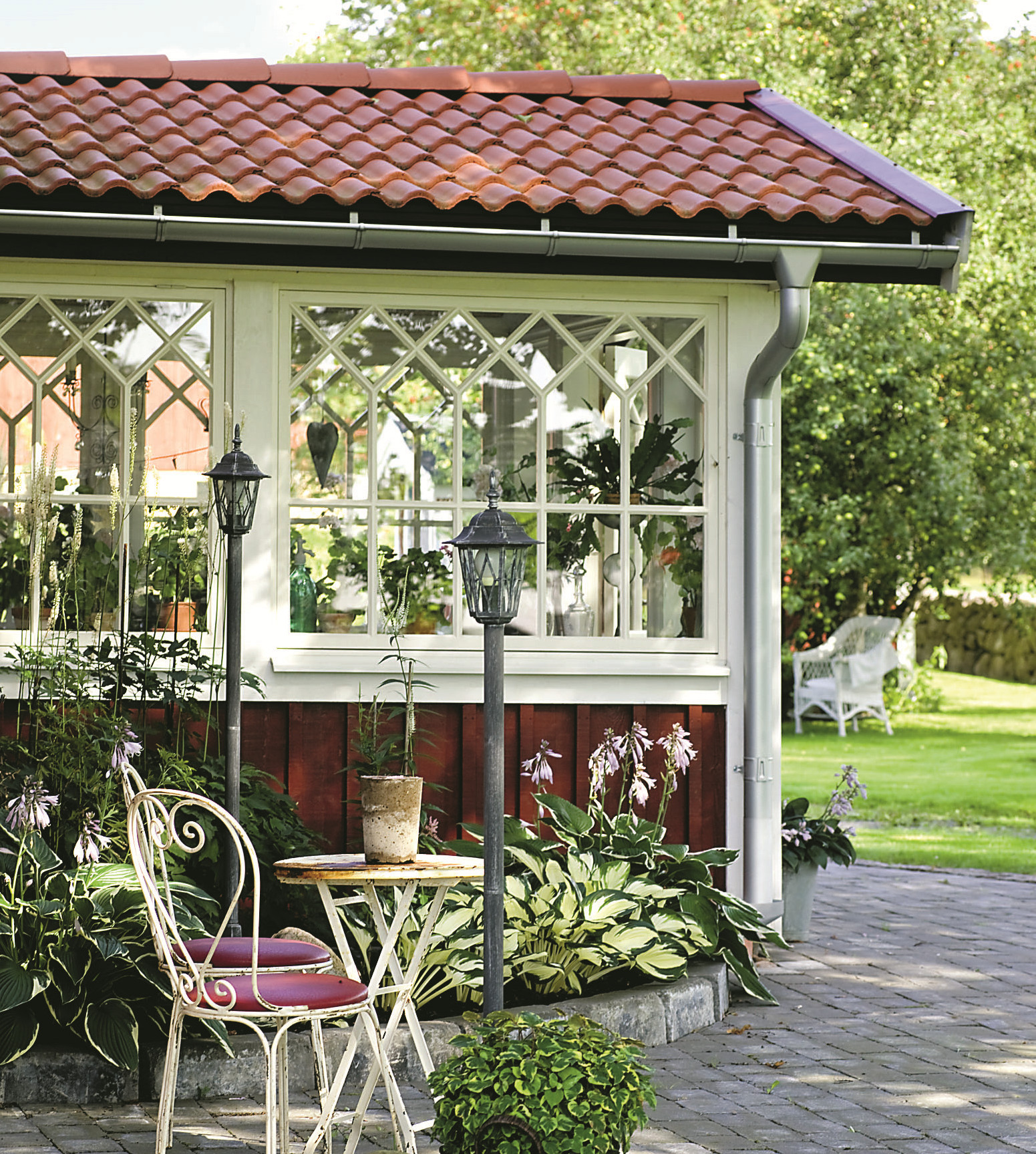 Задекорировать не слишком эстетичный фундамент позволят рабатки – длинные цветочные грядки с эффектными однолетниками. Или яркие ящики с декоративно-листными растениями, поставленные прямо на землю. Для украшения внутреннего пространства летней кухни используй кадочные растения или подвесные кашпо с ампельными сортами петуний и бегоний.