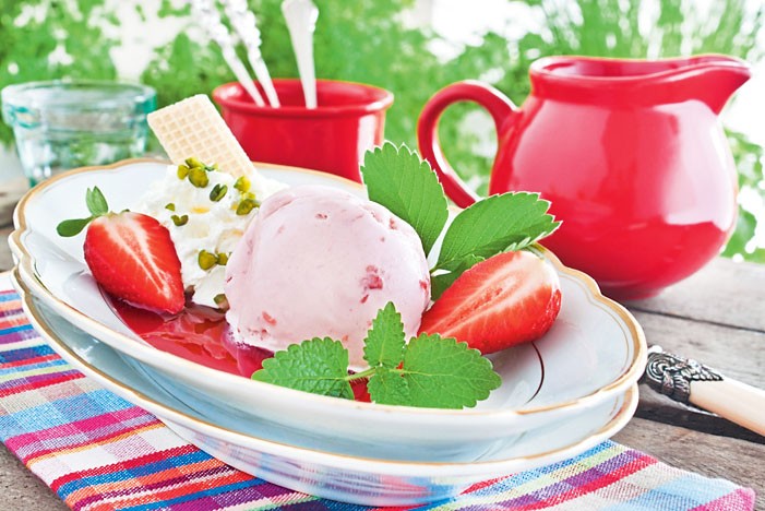 Приготовление: Клубнику промой, удали хвостики и измельчи в блендере с сахарной пудрой. Количество сахара можно уменьшить или увеличить по вкусу. Смешай йогурт с клубничным пюре в небольшой металлической миске. Отправь в морозилку, пока йогурт не застынет (примерно на 3 часа). Разложи десерт специальной ложкой для мороженого по креманкам и укрась мятой.