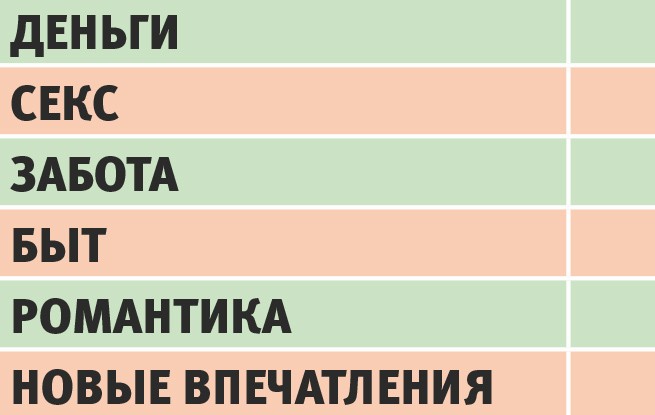Когда эмоции застилают разум, передавай бразды правления левому полушарию мозга, отвечающему за логику и рациональное мышление. Составь табличку (примерно такую, как наша) из 5–6 важных для тебя пунктов и оцени, в «плюсе» ты по ним в отношениях или в «минусе».