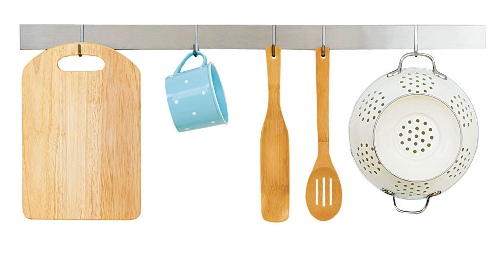 Дополнительно закрепи рейлинги, подвесив на них массу нужных на кухне предметов – доски, половники, ножи, прихватки, баночки для специй и т. п.