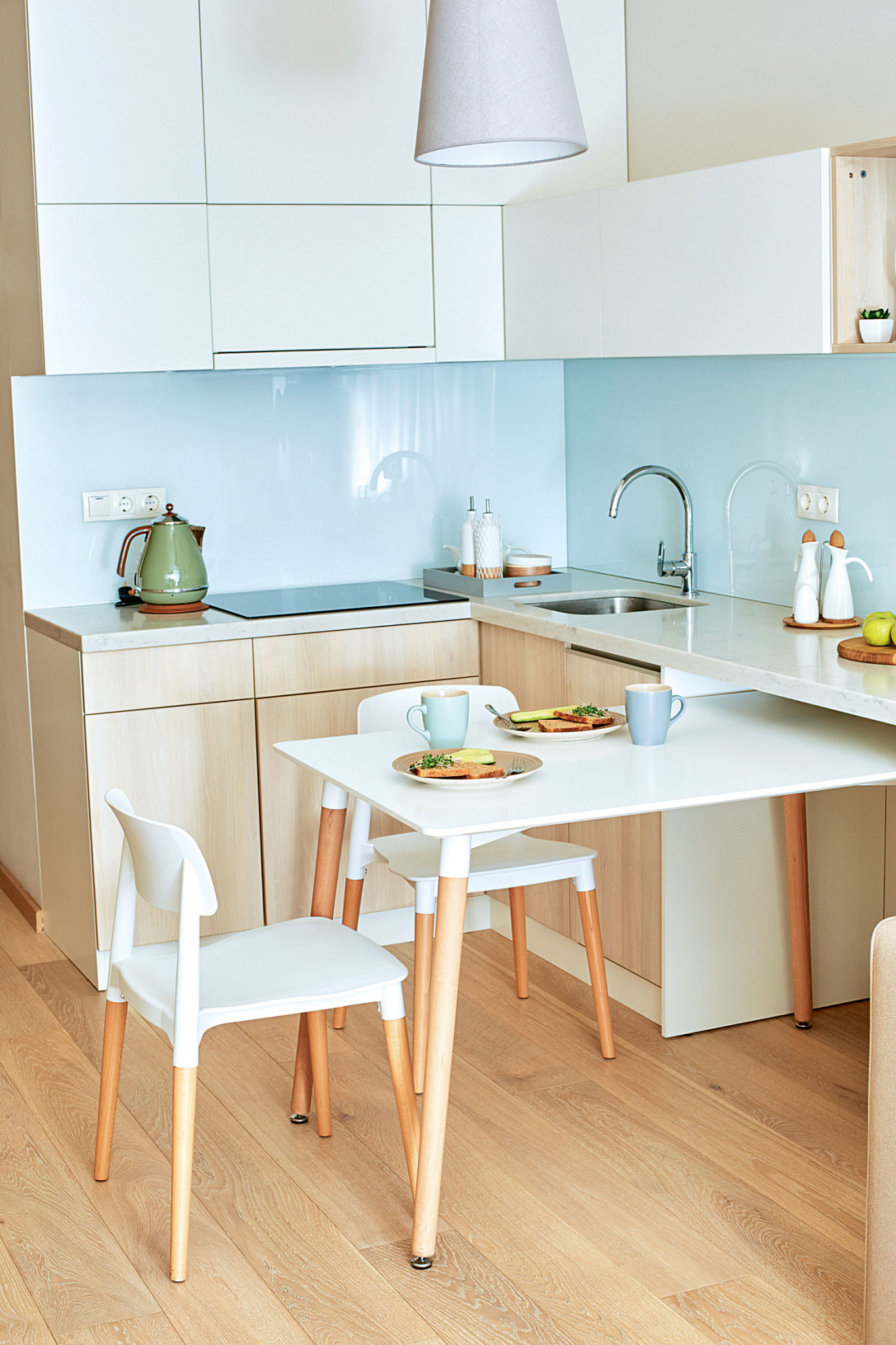 Хороший вариант – устойчивые табуретки без спинок, которые задвигаются под стол, экономя место. Также можно вынести обеденную зону в комнату и использовать кухню только для готовки.