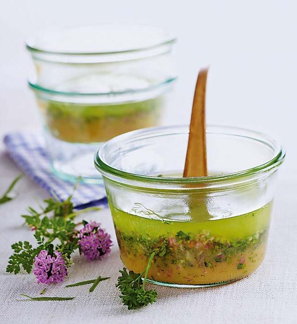 1. Винный соус соединить со щепоткой сахара, тремя видами масла и лимонным соком. Взбить венчиком.