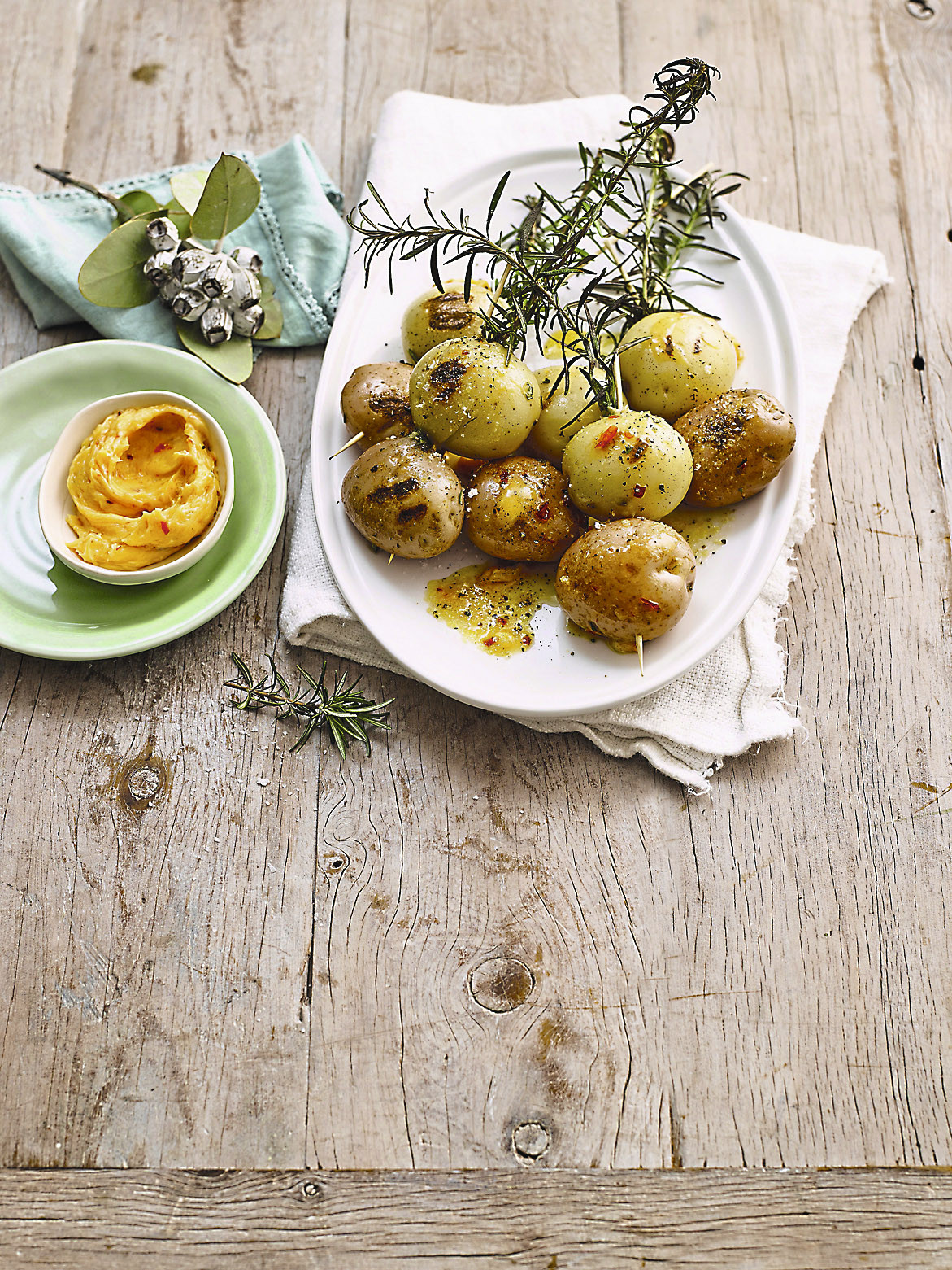 Приготовление. Помой картофель, сними шкурку. Если крупный – порежь на половинки.Смешай масло со специями, положи клубни в маринад на 1–2 часа. Насади на шампуры или шпажки, обжарь до готовности. Можно запечь в фольге на углях. Горячую картошку посыпь зеленью и полей кетчупом.