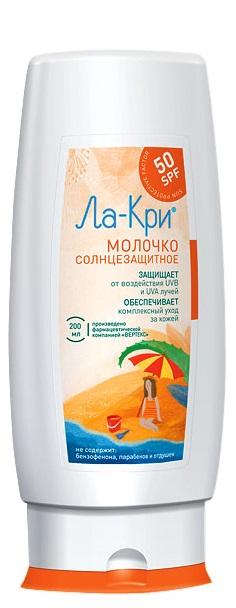 Молочко солнцезащитное Ла-Кри SPF50 образует на коже воздухопроницаемый барьер, препятствующий потере влаги. Водостойкая формула надежно защищает и во время купания. Цена ок. 550 руб.*