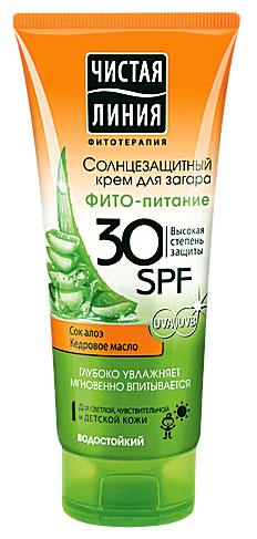 Солнцезащитный крем SPF 30 Чистая Линия «ФИТО-питание» подходит для детской и чувствительной кожи. Он защищает ее от UVA+UVB лучей на суше и в воде. Сок алоэ и кедровое масло в формуле крема оказывают увлажняющий эффект. Цена 310 руб.*
