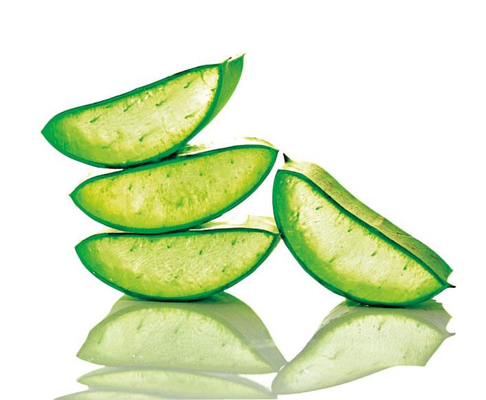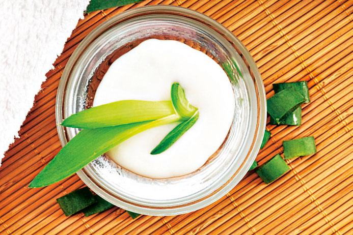 1. Надрежь вдоль стебель алоэ вера и достань мякоть чайной ложкой. Смешай ее в нержавеющий миске с творогом и медом.