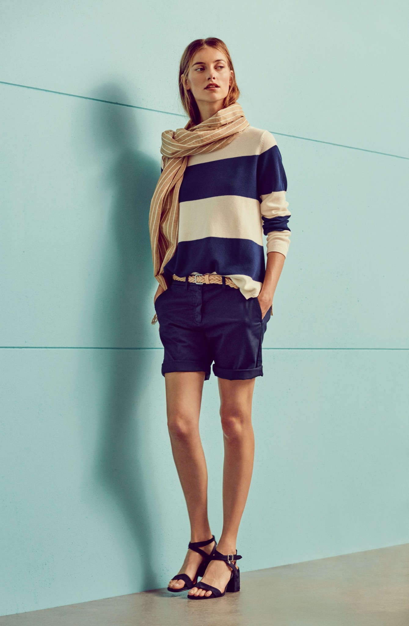 Морской стиль состоит из базовых вещей. Чтобы создать комплект в таком стиле, просто дополни топ или джемпер в сине-белую полоску джинсами, шортами, расклешенной юбкой, зауженными или расклешенными брюками. Отдавай предпочтение характерным классическим цветам: белому, темно-синему, черному и красному. Такой комплект идеально подойдет для городских будней.