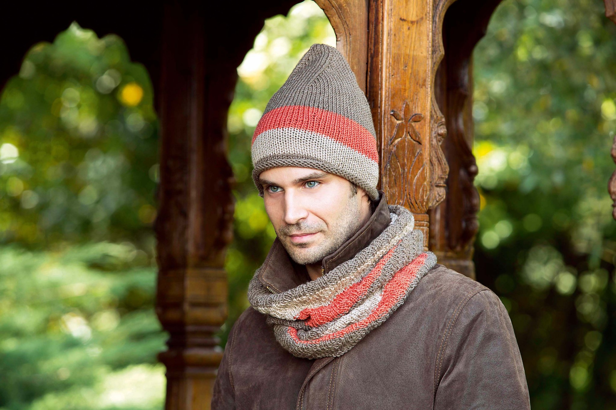 Тебе потребуется: пряжа Mondial Prima (100% мериносовой шерсти; 95 м/50 г) – для снуда и шапки по 50 г серо-коричневой, светло-серой и коралловой (№ 500, 400 и 721); спицы № 4,5.