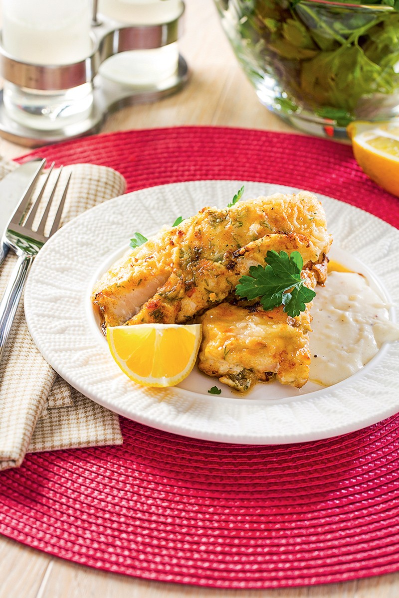 1. Филе трески крупно нарезать. Из лимонов выжать сок, 2 ст. л. оставить для соуса. Оставшийся сок смешать с горчицей, яйцом и укропом. Посолить и поперчить. Полить треску и оставить на 1 ч. Затем куски рыбы обвалять в муке (3 ст. л.) и обжарить с обеих сторон на растительном масле.