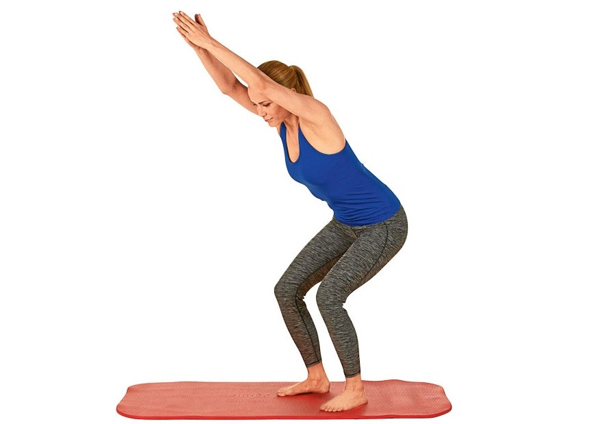 Поставь ноги на ширине плеч, руки вытяни над головой. Делай полуприседания с прямой спиной, напрягая задние ягодичные мышцы. Делай 3 подхода по 10 повторений.