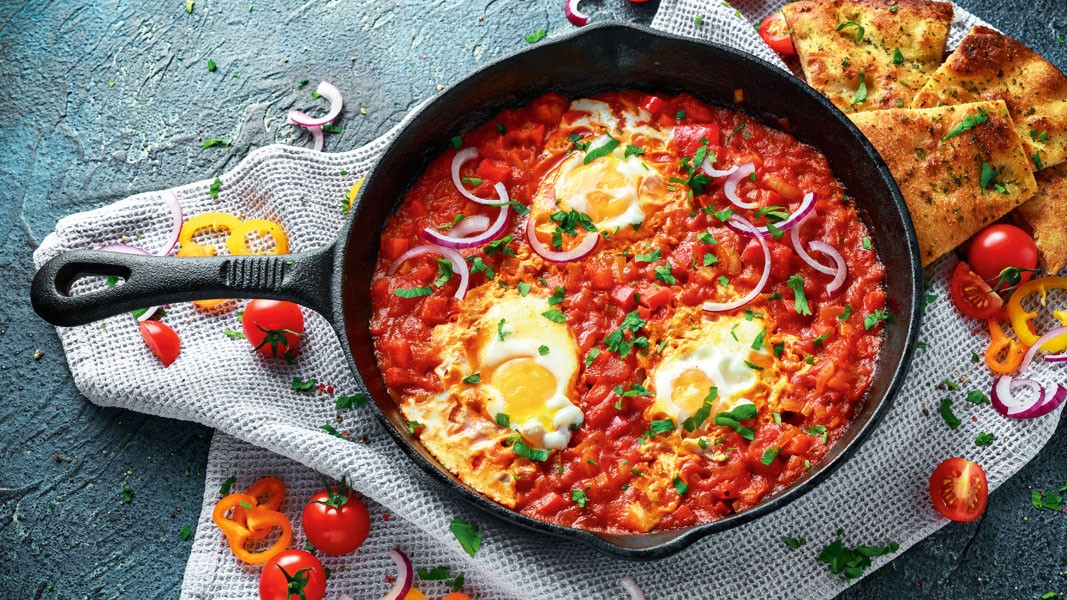 Хумус (закуска из нута, оливкового масла и лимонного сока) – король местной кухни. Подается с горячим хлебом. Самое популярное блюдо на завтрак – шакшука (на фото). Она похожа на яичницу, к которой еще добавляют помидоры. А главное уличное блюдо в Израиле – фалафель (шарики из нута или бобов, завернутые в лепешку).