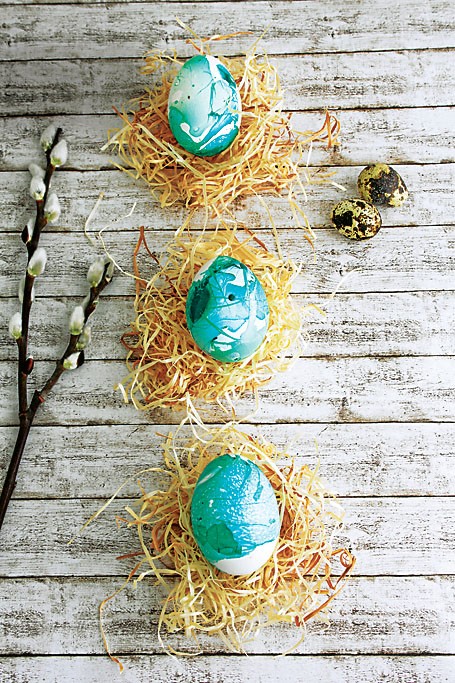 В краситель добавь растительного масла. Помести яйца и постарайтесь «поймать» побольше жирных капель.