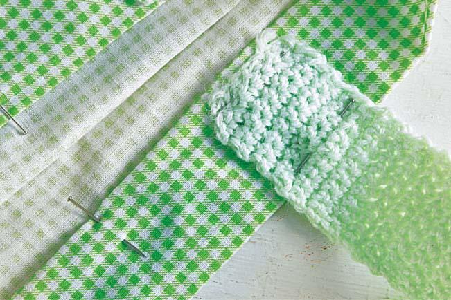 2. Из зеленой пряжи свяжи декоративную тесьму шириной 1,5–2 см (рисунок можешь выбрать любой, в зависимости от навыка в вязании) и аккуратно пришей ее, как это указано на фото.