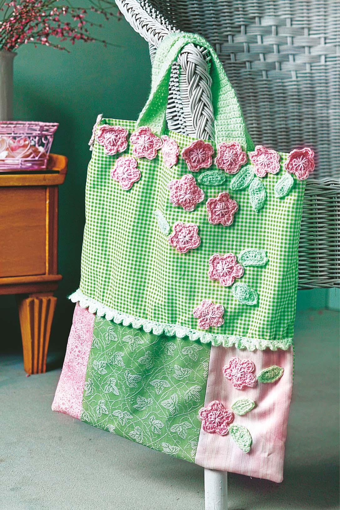 1. Сшей кусочки для лицевой части сумки и соедини лицевую сторону с тыльной. Подверни и подшей верхнюю часть. Из зеленой пряжи свяжи две ручки произвольной длины. Пришей их.
