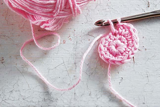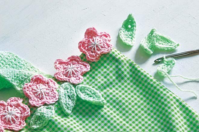 3. Теперь самая интересная часть работы – создание декоративных элементов. Из розовой пряжи свяжи маленькие цветы (15 штук). А из зеленой – листья (10 штук).