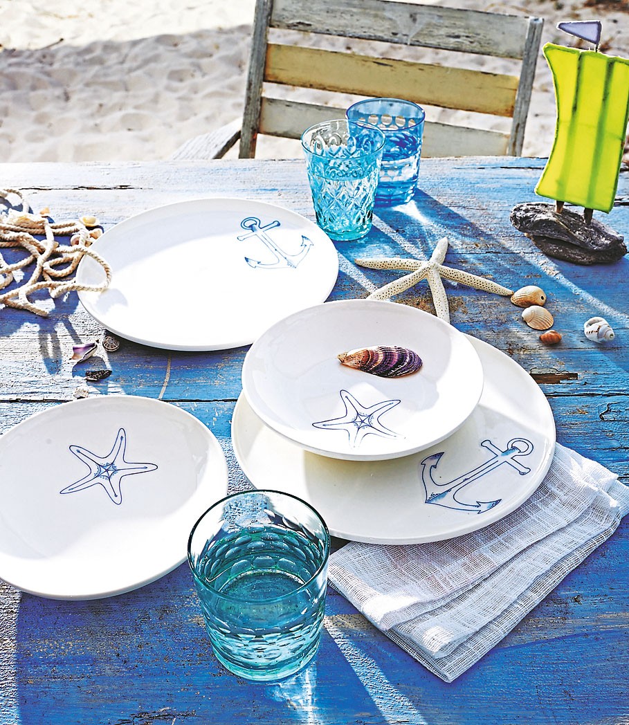 Запасись минимальным набором посуды с морской символикой – специально для летних дней. А также всегда используй при сервировке льняные салфетки и натуральные элементы декора. Например, крупные ракушки – будет стильно!