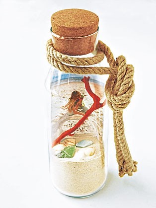 4. Закончи работу. Сверху ракушек положи коралл, вставь пробку и повяжи горлышко бечевкой.