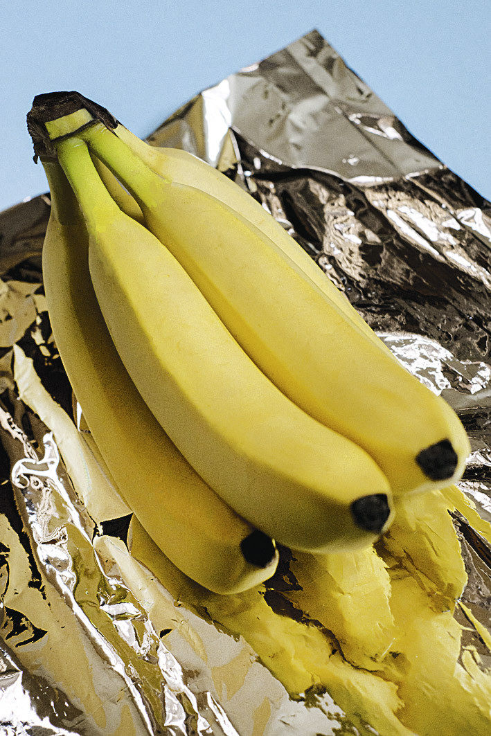 Банановая кожура через 2–3 дня начинает чернеть и покрывается коричневыми пятнами. Как сохранить этот полезный продукт? Оберни верхнюю часть фрукта фольгой, это продлит его срок годности еще на пару дней.