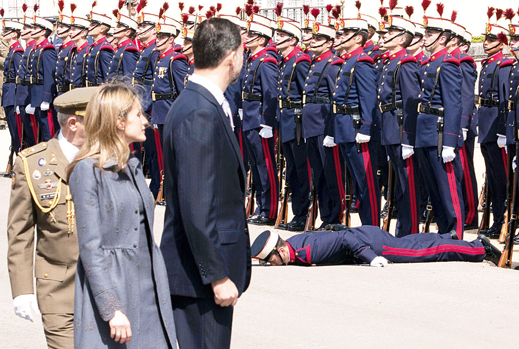 Невеселый случай произошел в Мадриде: во время томительного ожидания высоких гостей из Британии, принца Чарльза и герцогини Корнуольской Камиллы возле дворца Прадо, один из солдат не выдержал нервного напряжения и шлепнулся носом в асфальт буквально в нескольких метрах от первой четы Испании Фелипе и Летиции. «Опаздывать нехорошо еще и поэтому», – перешептывались потом подданные, когда снимки инцидента оказались на передовицах всех газет – вместо, собственно, главных «виновников» события.
