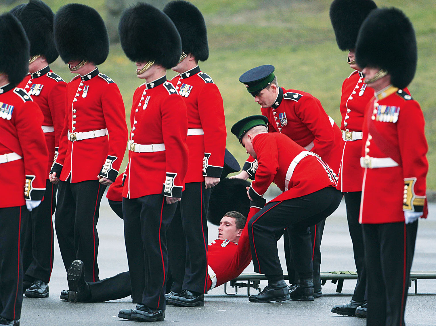 Бедолаги рушатся при всем честном народе не столько от жаркого солнца (где ж его взять в северной стране), сколько из-за веса своей формы, в частности головного убора, давящего на затылок. В этом обмундировании им надлежит стоять не шелохнувшись в течение длительного времени, но организм не обманешь: физика сопротивляется социальным конструктам – и происходит то, что происходит. Ну а еще сказывается неопытность гвардейцев: в королевское подразделение каждая воинская часть командирует своих подопечных поочередно, и проводят они там всего две недели, не успевая привыкнуть к тяготам во всех смыслах этого слова.