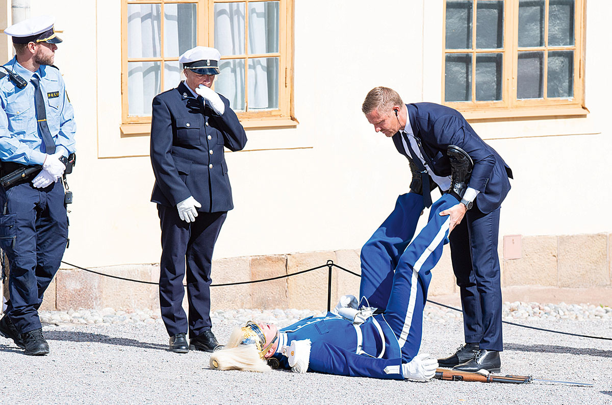 За несколько минут до начала таинства послышались глухие звуки – два гвардейца, находившиеся на посту, пали ниц. Им быстро и максимально незаметно оказали первую помощь, благо порядок действий уже отточен до мелочей. Бравые парни из Högvakten (с северносаамского – гвардейское формирование) складывались, как домино, и во время крещения принцессы Леоноры, и на службе в честь Дня благодарения принцессы Эстель, и на свадьбе принцессы Виктории и принца Даниэля. А в 2018-м, во время службы в честь Дня благодарения принцессы Адриенны, одного из гвардейцев стошнило на глазах у всех гостей.