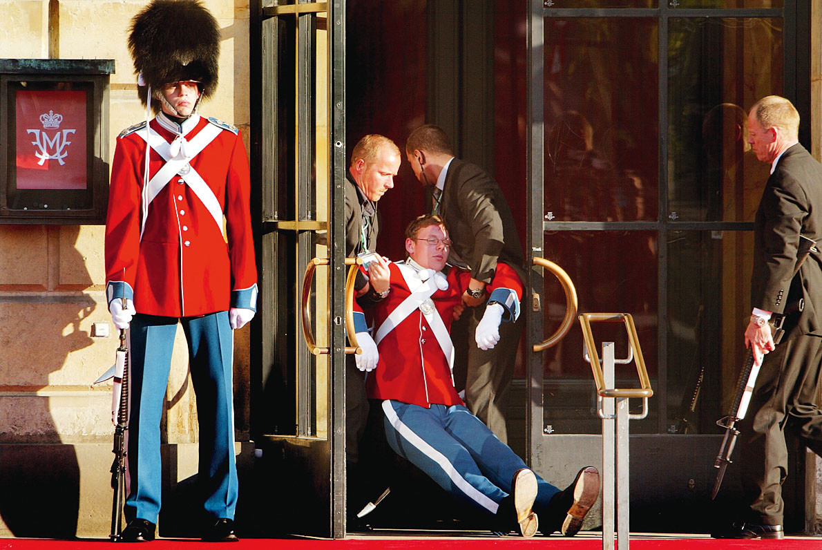 Щекотливость ситуации в том, что когда кто-то стоящий в почетном карауле падает, коллеги не имеют права подхватывать несчастного под руки, оказывать ему какую-либо помощь и даже звать кого-то, чтобы это сделали другие, их миссия – продолжать нести службу неподвижно. К счастью для потерявшего сознания у театра, произошедшее заметили служащие и быстро увели гвардейца в прохладное помещение и отпоили водой. Этот случай для Дании далеко не единичный. Один из последних инцидентов имел место в 2020-м во дворце Кристиансборг: характерный хлопок раздался прямо в тот момент, когда королева Маргрете II и ее супруг Генри приветствовали гостей.