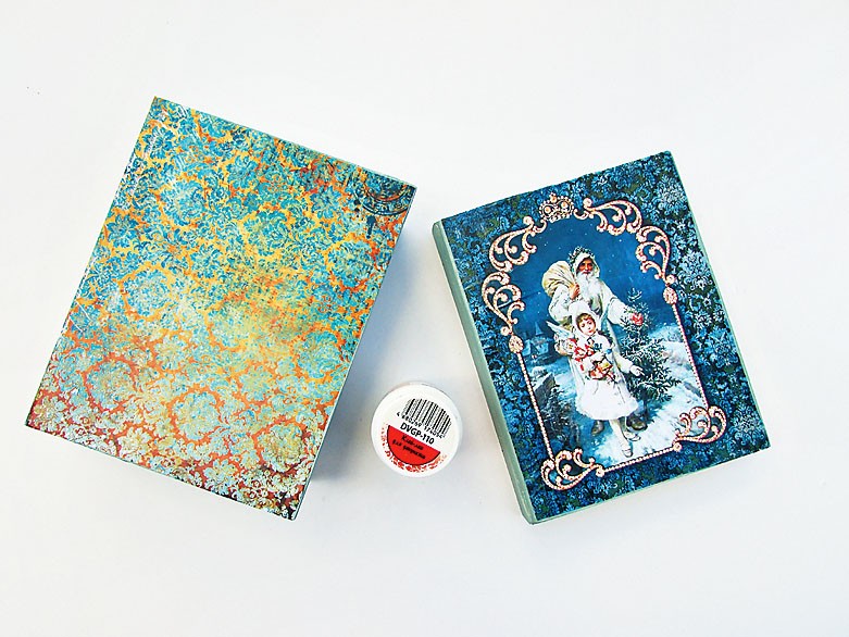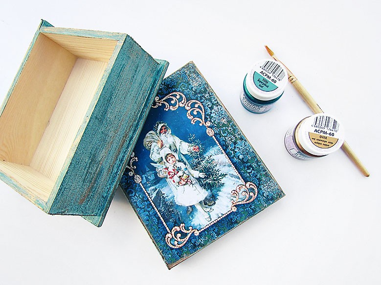 Плоской синтетической кистью нанеси лак. Дождись полного высыхания. Вот и все, шкатулка с новогодним декором готова!