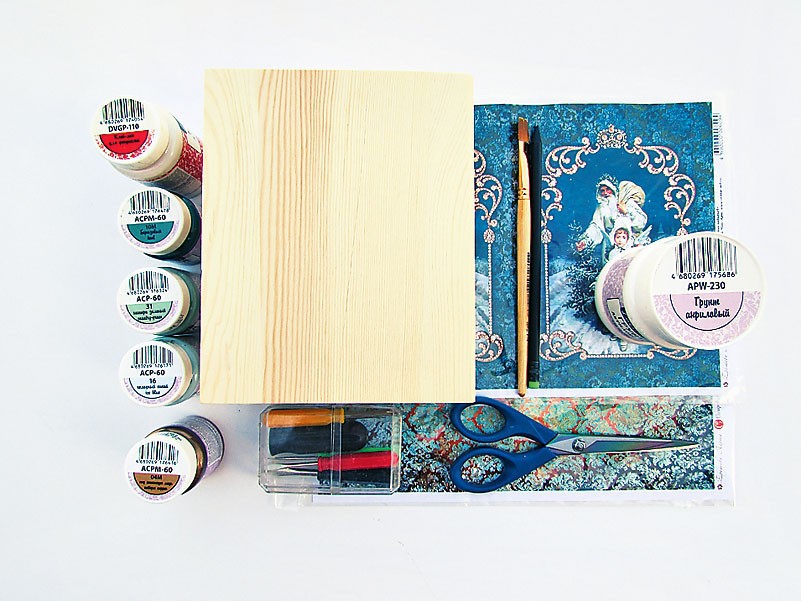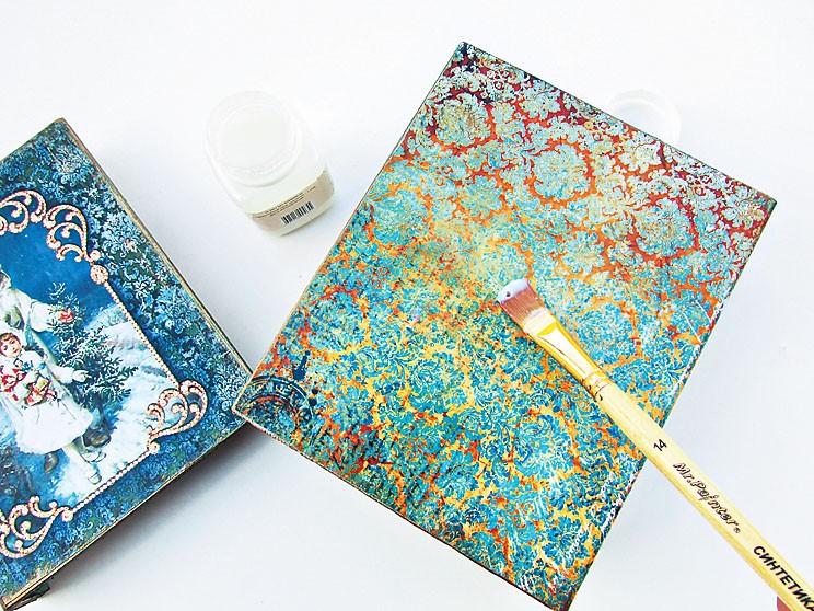 Неоклеенные поверхности затонируй акриловыми красками «металлик» медного и бирюзового цветов. Краску наноси методом «сухой кисти», не используя воду. Кисть сначала окуни в краску, затем несколько раз проведи ей по чистому листу бумаги, удаляя излишки краски. После этого нанеси краску на заготовку, легкими движениями проводя кистью по всей ее поверхности.