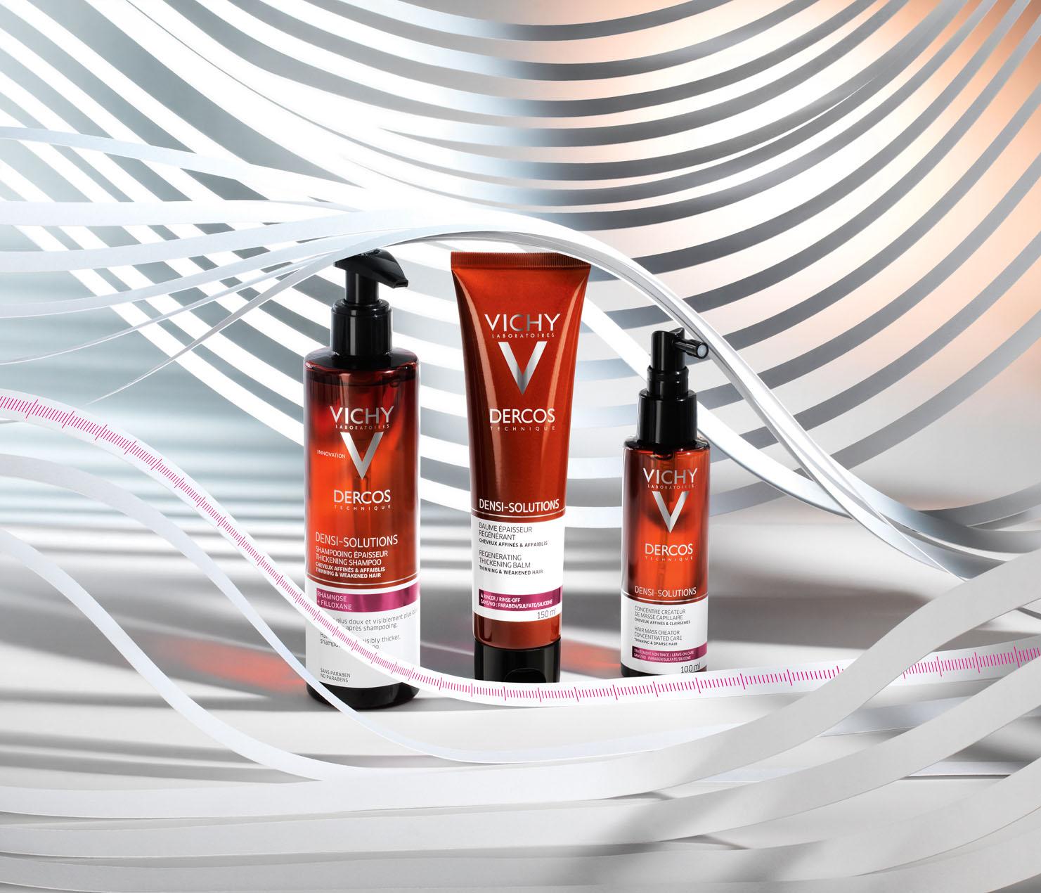 Гамма по уходу за волосами Densi-Solutions от Vichy комплексно решает проблему истончения. После 6 недель применения сыворотки для роста, уплотняющего шампуня и восстанавливающего бальзама волосы на 96% становятся более плотными и на 91% – объемными.