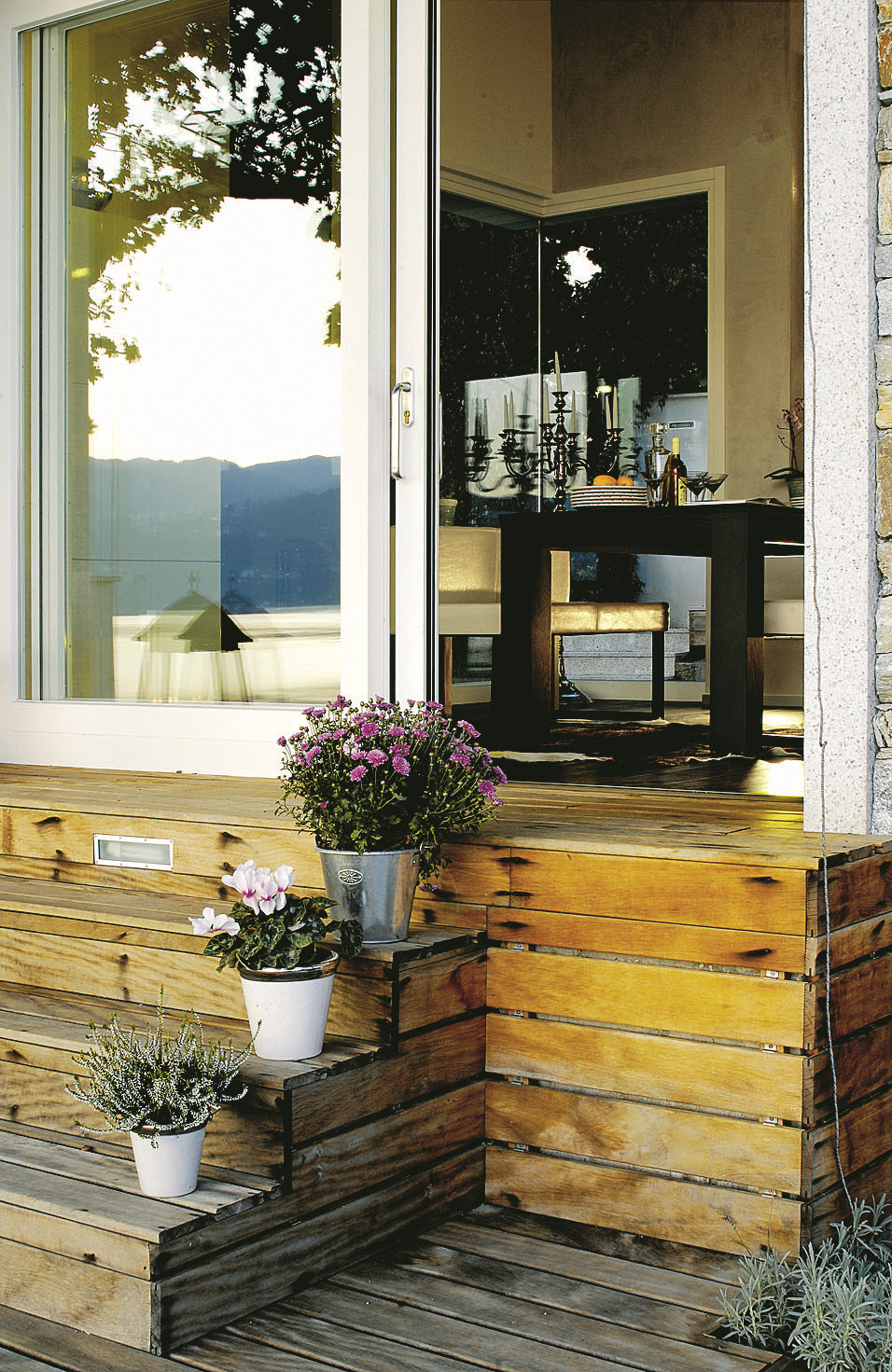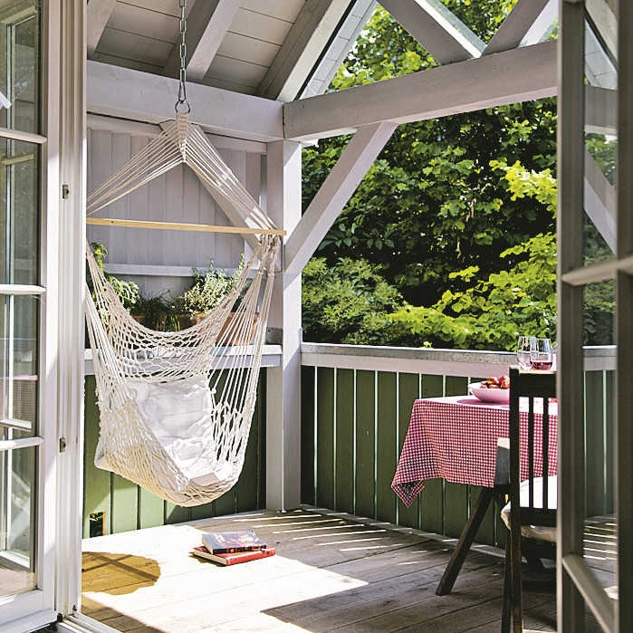 Деревянные веранды нужно красить не реже, чем раз в 2–3 сезона. Если обычно ты придерживалась однотонной гаммы, попробуй подойти к вопросу нетрадиционно и использовать разные оттенки. С их помощью можно создать несколько уютных зон. Не забывай и о растениях – в горшках и кадках. И о прелестных садовых светильниках, которые можно спрятать среди цветов. Мы советуем выбирать модели, работающие от солнечных батарей.