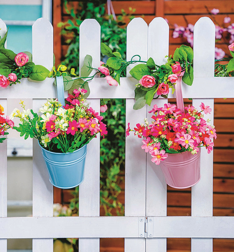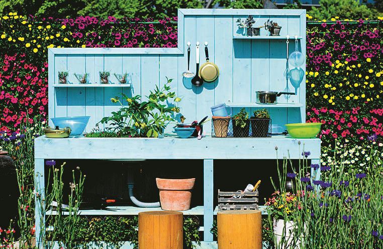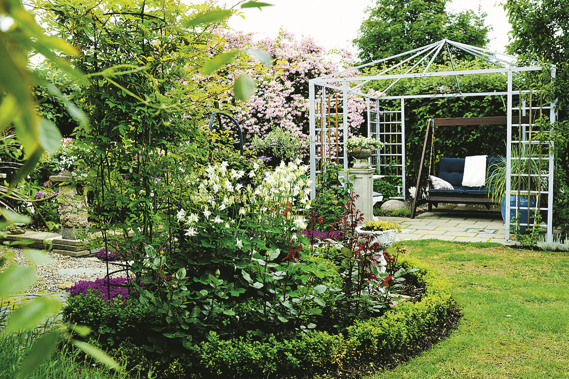 Главное – это порядок. Клумбы, еще не занятые растениями, декорируй гравием или мульчирующими материалами – натуральными или искусственными (последние ярче). Обустрой площадку: поставь скамейку (садовые качели, гамак), а за ней установи перголу с вьющимися розами и клематисами, а с двух сторон – вазоны с цветами.
