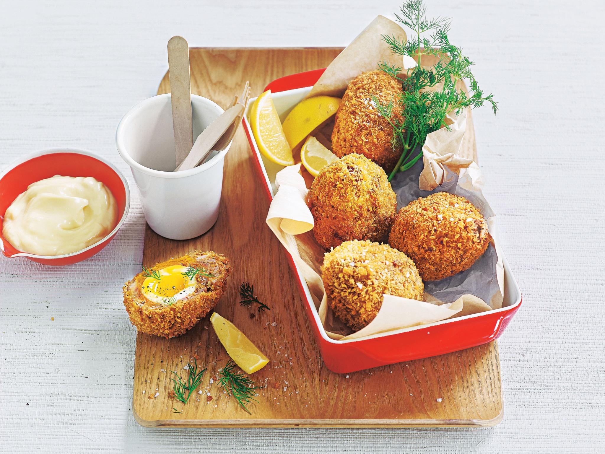 1. Яйца (8 шт.) сварить вкрутую, охладить и очистить. Свинину перемешать с 1 сырым яйцом, 2 ст. л. панировочных сухарей, петрушкой, мускатным орехом, посолить и поперчить. Из фарша сделать лепешки, на каждую положить сваренное вкрутую яйцо и завернуть его. Сформовать шарики.