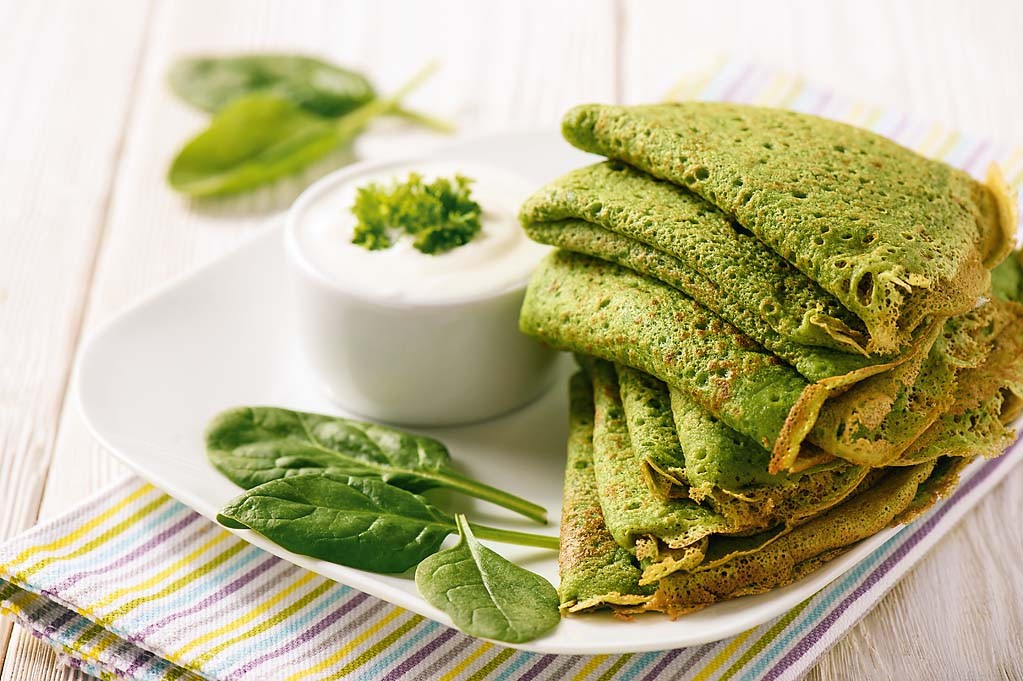 Например, приготовь блинчики из 75 г овсяной муки, 200 мл молока, одного яйца и чайной ложки спирулины. Выпекай на кокосовом масле. Подавай с йогуртом.