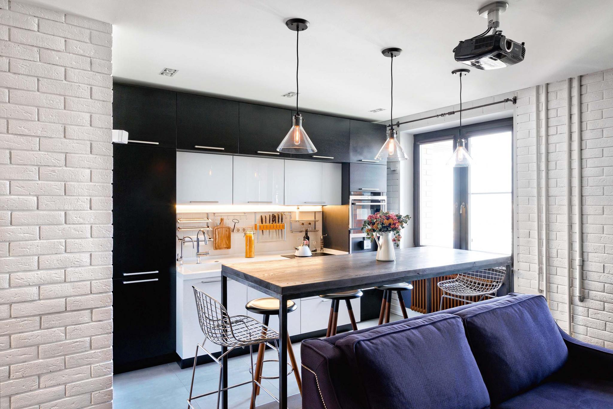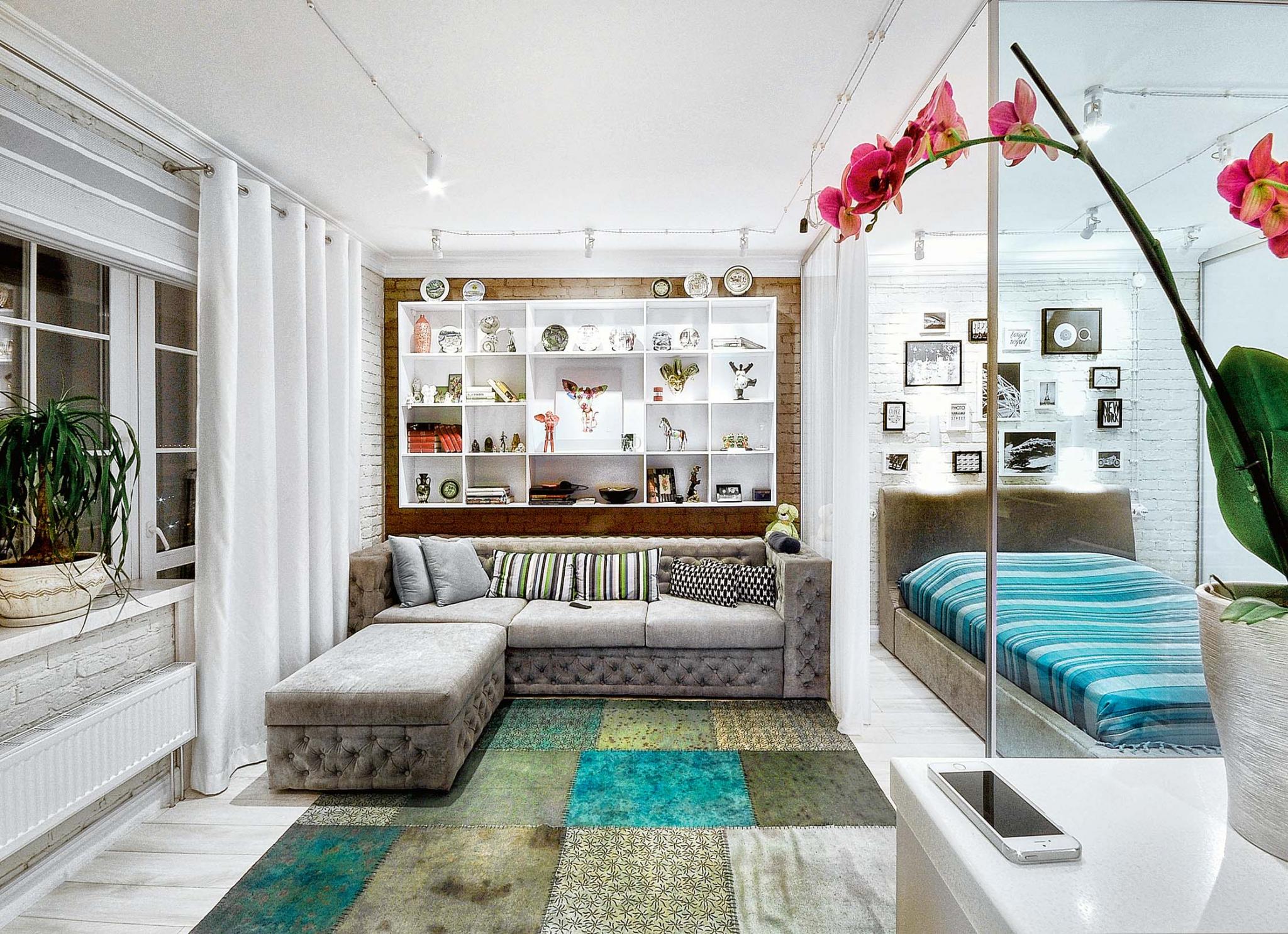 Не нужно превращать маленькую квартиру в студию, лишенную внутренних перегородок: возникнут проблемы с размещением мебели, станут заметны скромные размеры комнаты, исчезнет уют. Например, лучше устроить отдельную спальню или расположить ее в алькове. Для этой цели также подойдут мобильные системы (раздвижные двери или занавеси, экраны, ширмы): они позволяют внести разнообразие, изменить пропорции и атмосферу помещения. Функцию разделителя соседних зон может выполнять мебель: барная стойка, высокая спинка дивана, комод – такой прием помогает создать ощущение легкости и простора. Удачный вариант при студийной планировке – отдельно стоящая компактная перегородка, которая разделяет кухню-столовую и гостиную.