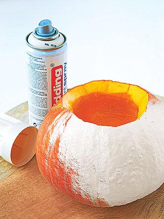 3. Встряхни баллончик с краской (лучше всего белой) и равномерно покрась тыкву со всех сторон, чтобы совсем не оставалось просветов.